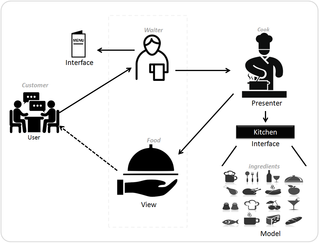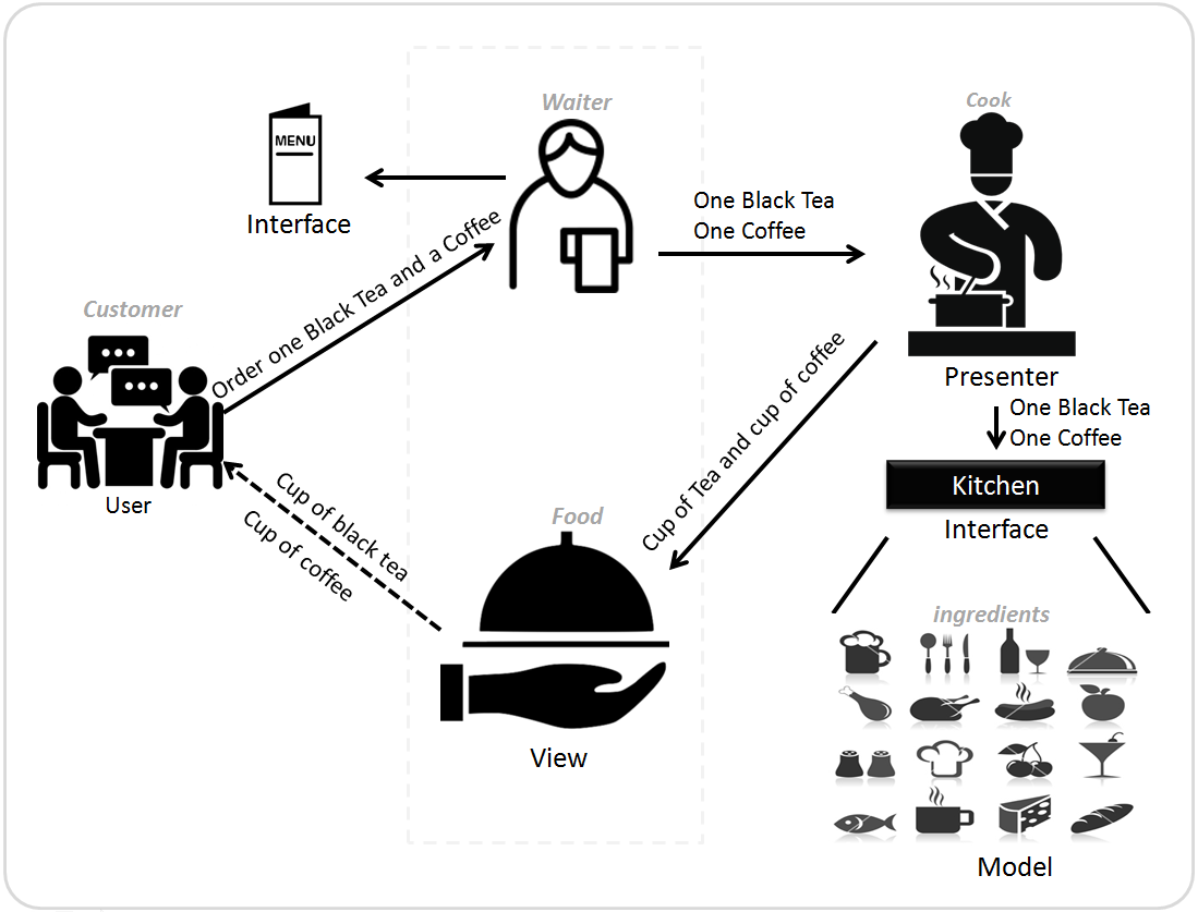 • Cook will prepare food and deliver it on a plate or cup based on order. This action is nothing but presenter updating the view with result which will be deliver to end user(customer)